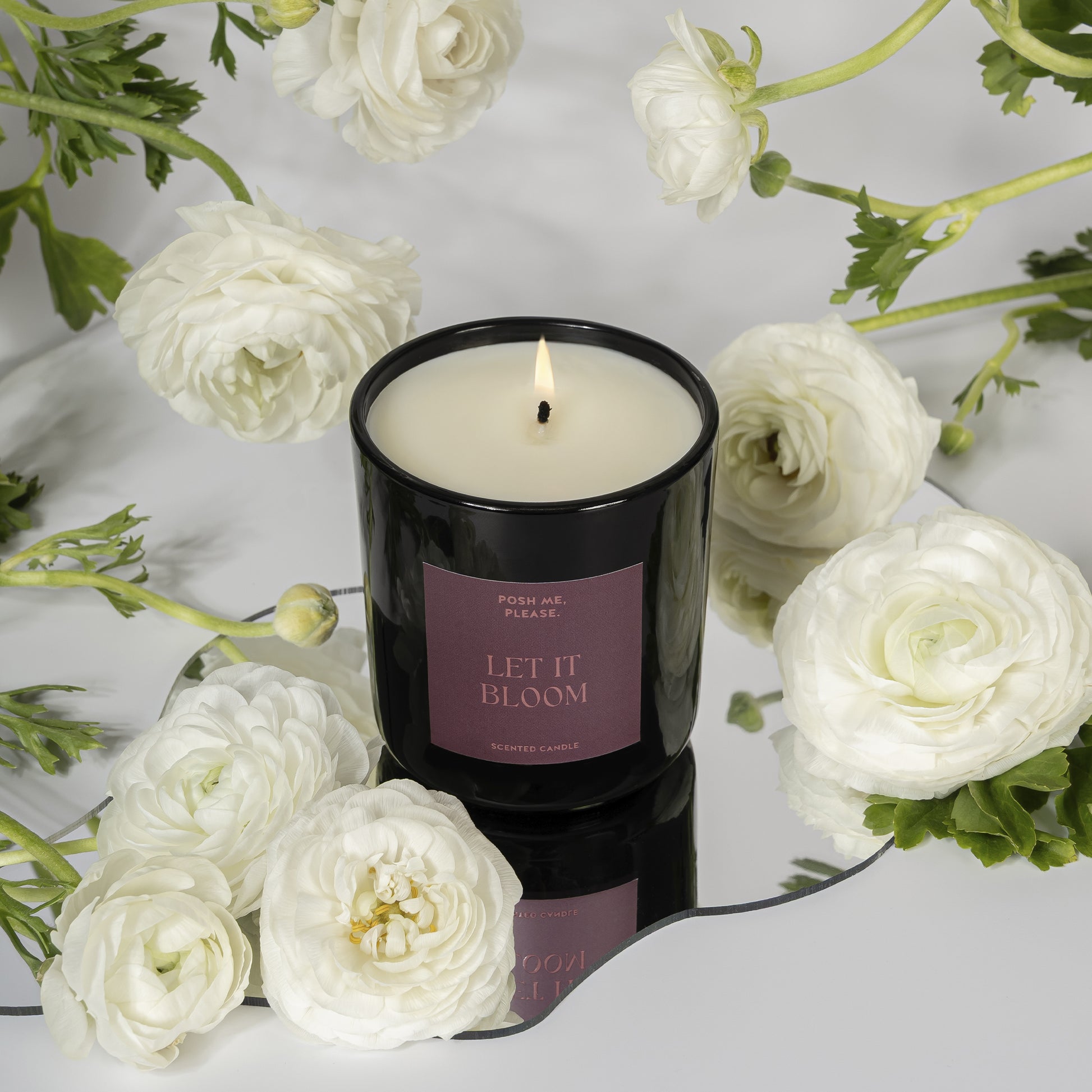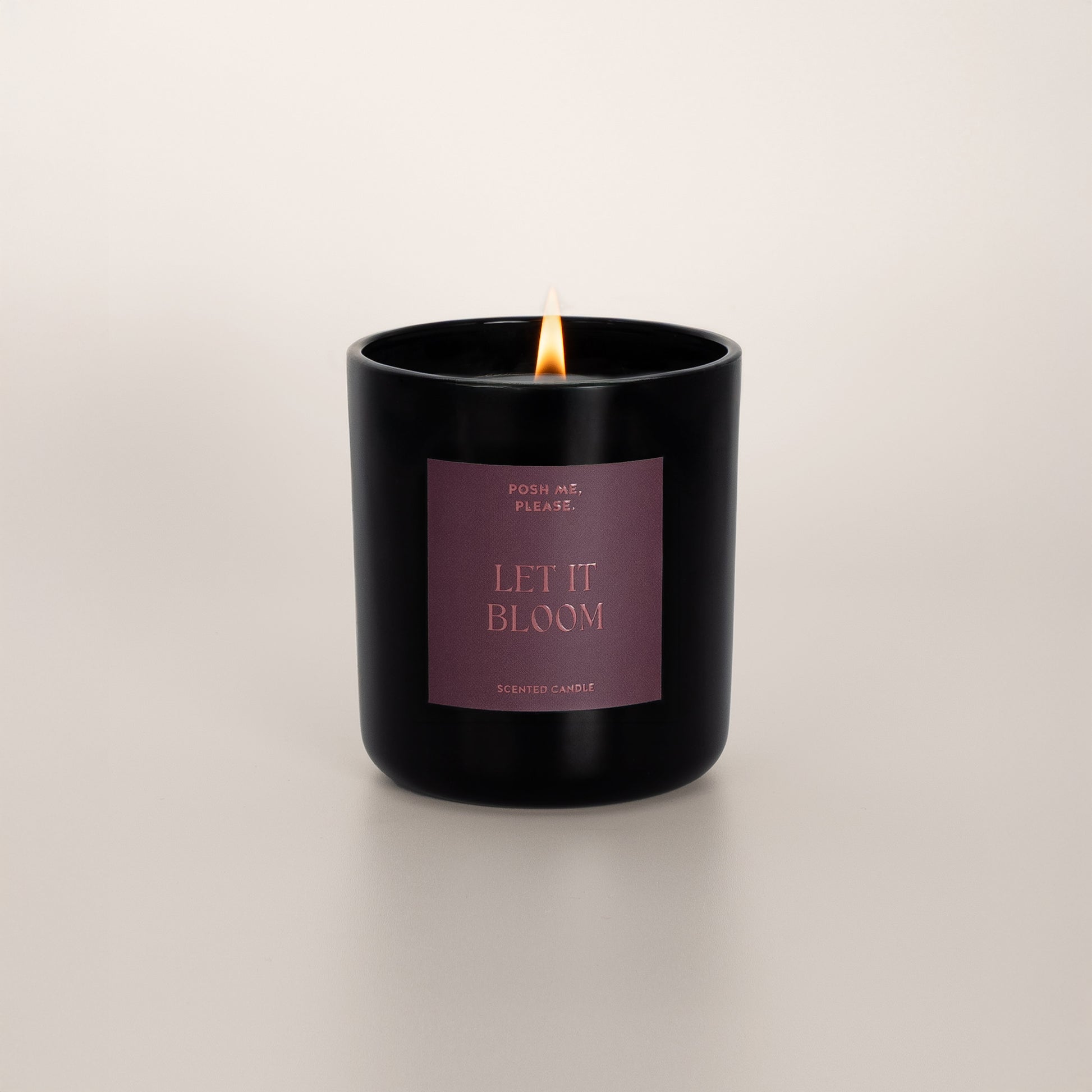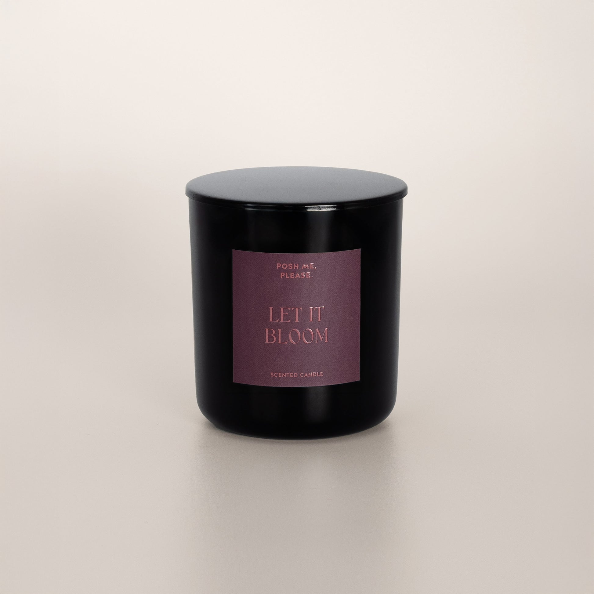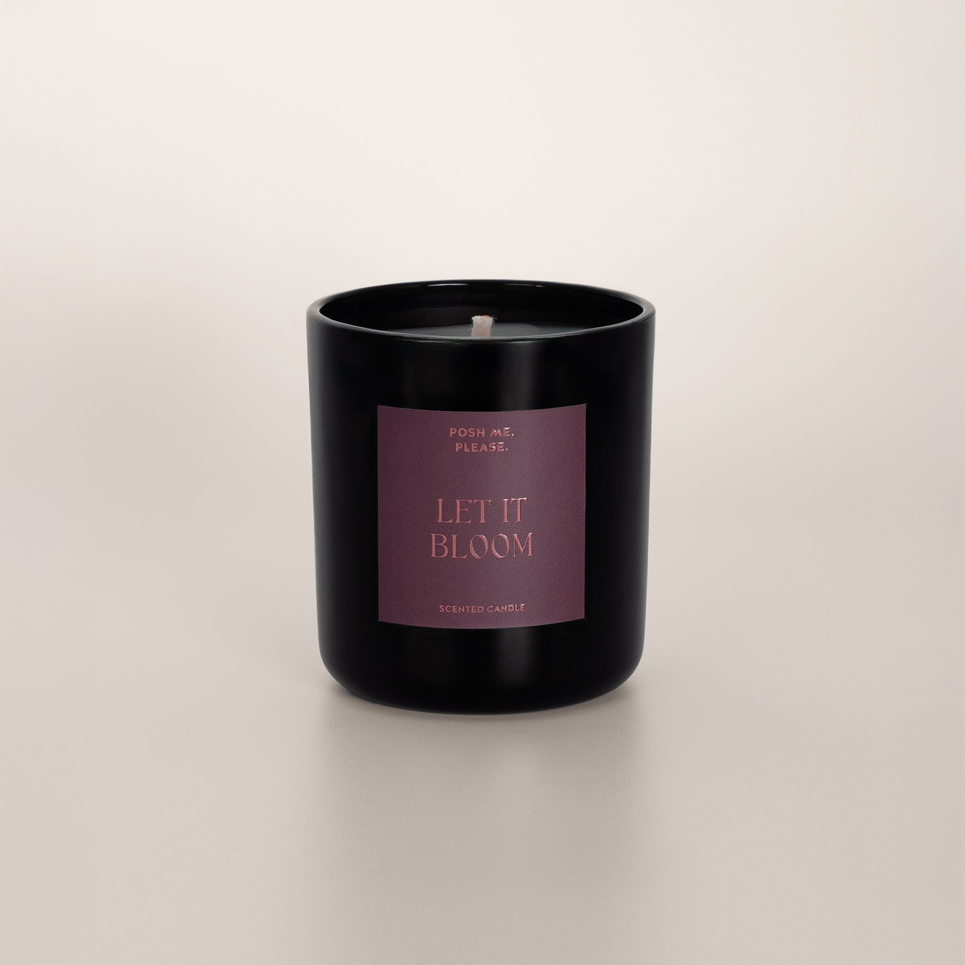 Its minimalist and timeless aesthetic is reflected in the sleek black glossy glass vessel, paired with a black metal lid, elevating each candle into a true object of desire. Each piece is presented in a black minimalist box with the POSH ME, PLEASE. logo embossed in subtle relief, adding a final touch of quiet sophistication.